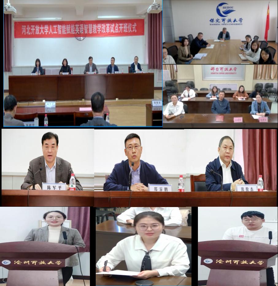 2023年,我校繼續(xù)承擔國開人工智能賦能英語智慧教學改革項目,來自保定、邯鄲、邢臺、滄州四所開放大學的208名學生將參加試點課程的學習。為順利推進教改項目的實施,10月30日上午,我校在滄州開放大學通過線上線下相結合的方式舉行智慧教學改革試點開班儀式。學校黨委常委、副校長陳軍平,國家開放大學外語教學部副部長鄭霽鵬,滄州開放大學黨委書記熊俊杰、黨委副書記、校長郝清秀、副校長劉俊民,保定開放大學黨委書記夏冰、副校長顧文博,邢臺開放大學副校長呂建軍,教務處副處長李培學及各試點市校教學負責人、教學團隊教師和參與試點的全體學生參加了開班儀式。開班儀式由教學支持部主任張淑蓮教授主持。滄州開放大學黨委書記熊俊杰為開班儀式致辭。
