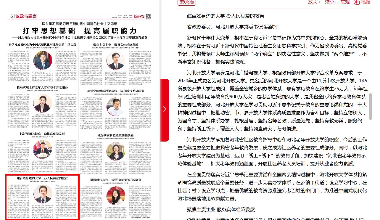 在全面貫徹落實習近平總書記重要講話和全國兩會精神過程中,河北開放大學體系將緊緊圍繞高質量發展這個首要任務,進一步完善辦學體系,在鄉鎮(街道)設立學習中心,在社區(村)設立學習點,把最優質的教育資源推送到老百姓的家門口,為推進中國式現代化河北場景落地見效貢獻力量。