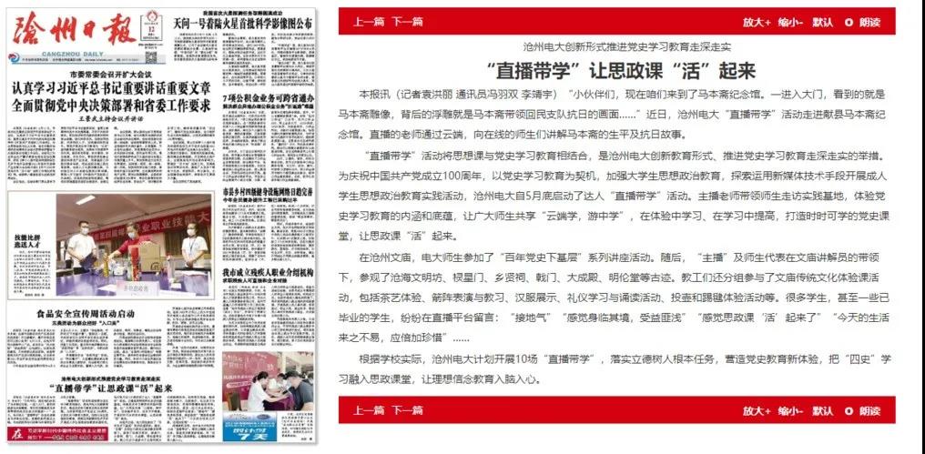 6月12日,《滄州日報(bào)》頭版以《滄州電大創(chuàng)新形式推進(jìn)黨史學(xué)習(xí)教育走深走實(shí)“直播帶學(xué)”讓思政課“活”起來》為題,對(duì)學(xué)校日前舉辦的“紅色‘冀’憶·云實(shí)踐”達(dá)人直播帶學(xué)活動(dòng)進(jìn)行報(bào)道,網(wǎng)易新聞、今日渤海網(wǎng)、滄州新聞網(wǎng)等主流媒體同步推送,對(duì)滄州電大這一創(chuàng)新形式及其實(shí)效給予充分肯定。