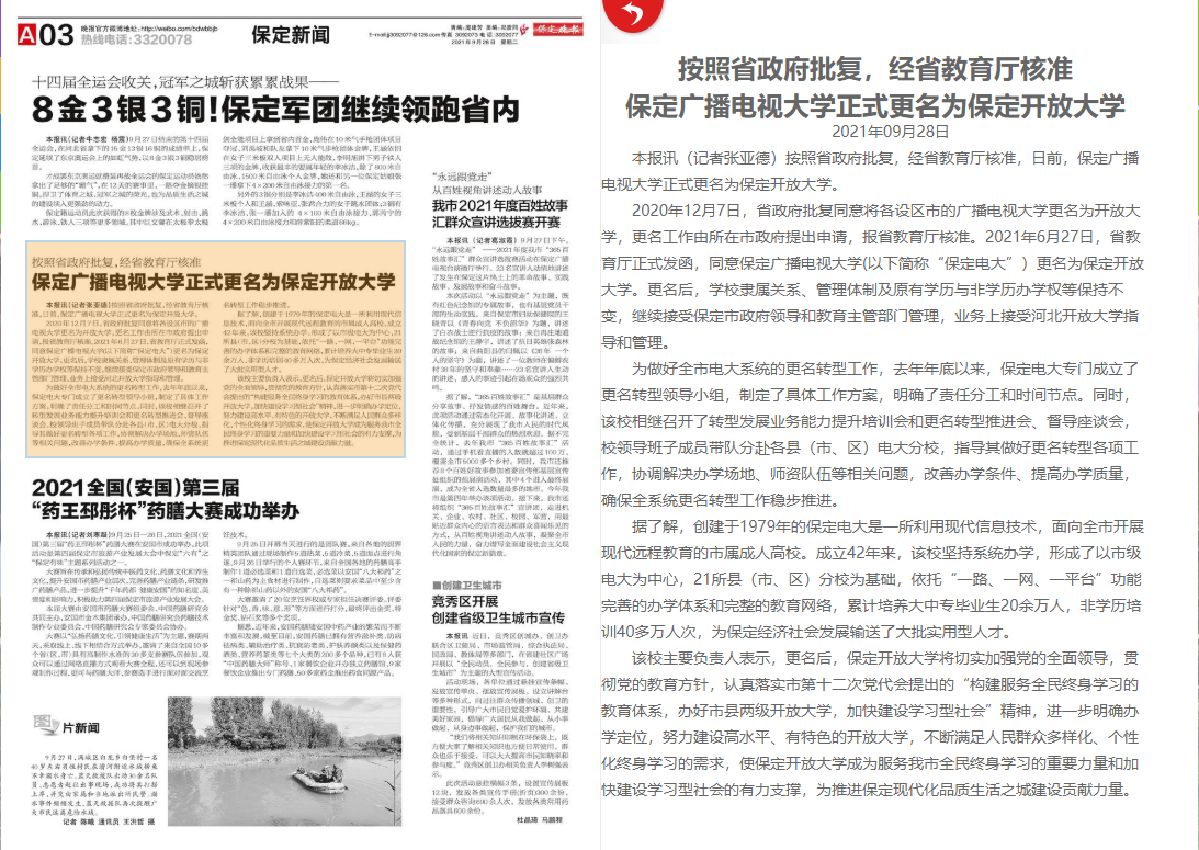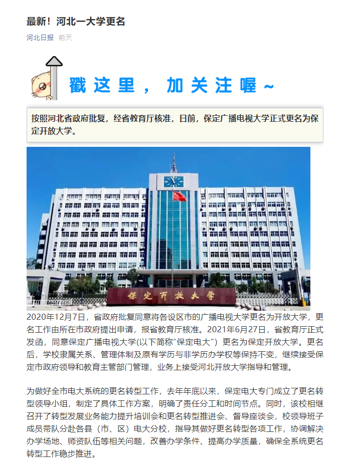 2020年12月7日,省政府批復(fù)同意將各設(shè)區(qū)市的廣播電視大學(xué)更名為開放大學(xué),更名工作由所在市政府提出申請,報省教育廳核準。2021年6月27日,省教育廳正式發(fā)函,同意保定廣播電視大學(xué)(以下簡稱“保定電大”)更名為保定開放大學(xué)。更名后,學(xué)校隸屬關(guān)系、管理體制及原有學(xué)歷與非學(xué)歷辦學(xué)權(quán)等保持不變,繼續(xù)接受保定市政府領(lǐng)導(dǎo)和教育主管部門管理,業(yè)務(wù)上接受河北開放大學(xué)指導(dǎo)和管理。