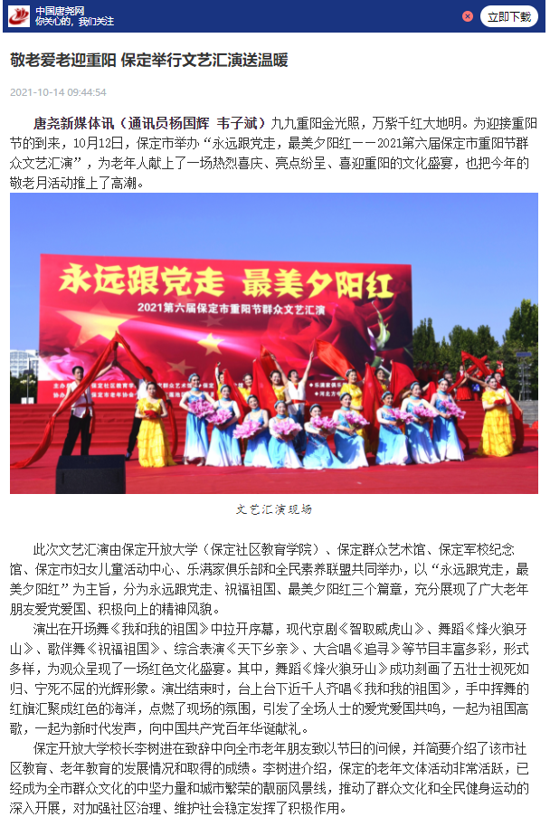 此次文藝匯演由保定開放大學(保定社區教育學院)、保定群眾藝術館、保定軍校紀念館、保定市婦女兒童活動中心、樂滿家俱樂部和全民素養聯盟共同舉辦,以“永遠跟黨走,最美夕陽紅”為主旨,分為永遠跟黨走、祝福祖國、最美夕陽紅三個篇章,充分展現了廣大老年朋友愛黨愛國、積極向上的精神風貌。