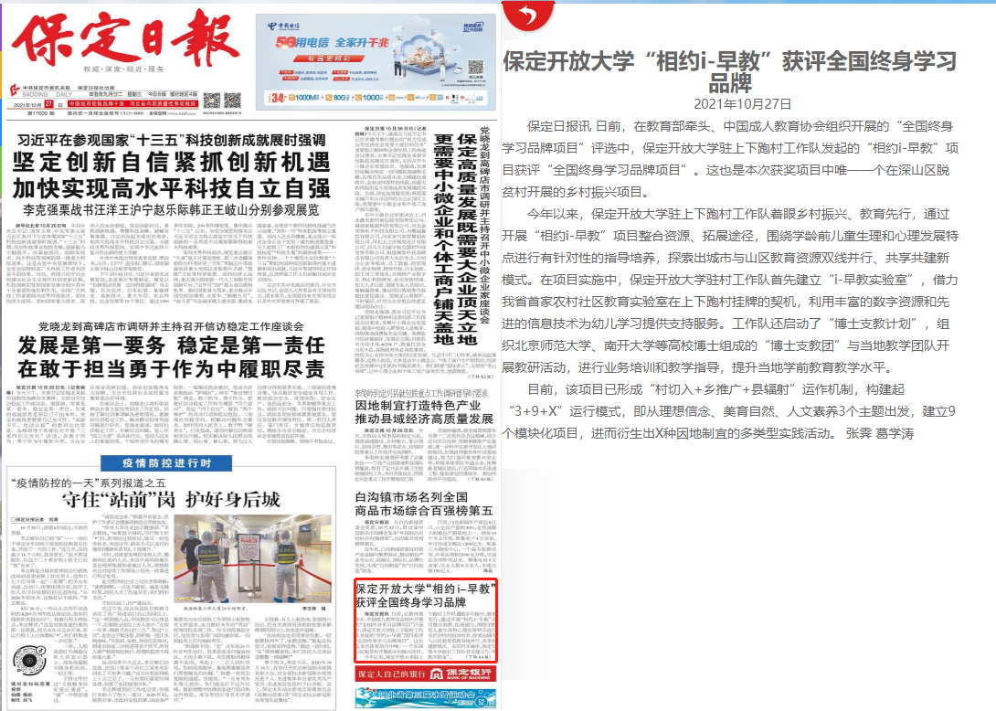 保定日?qǐng)?bào)訊 日前,在教育部牽頭、中國成人教育協(xié)會(huì)組織開展的“全國終身學(xué)習(xí)品牌項(xiàng)目”評(píng)選中,保定開放大學(xué)駐上下跑村工作隊(duì)發(fā)起的“相約i-早教”項(xiàng)目獲評(píng)“全國終身學(xué)習(xí)品牌項(xiàng)目”。這也是本次獲獎(jiǎng)項(xiàng)目中唯一一個(gè)在深山區(qū)脫貧村開展的鄉(xiāng)村振興項(xiàng)目。