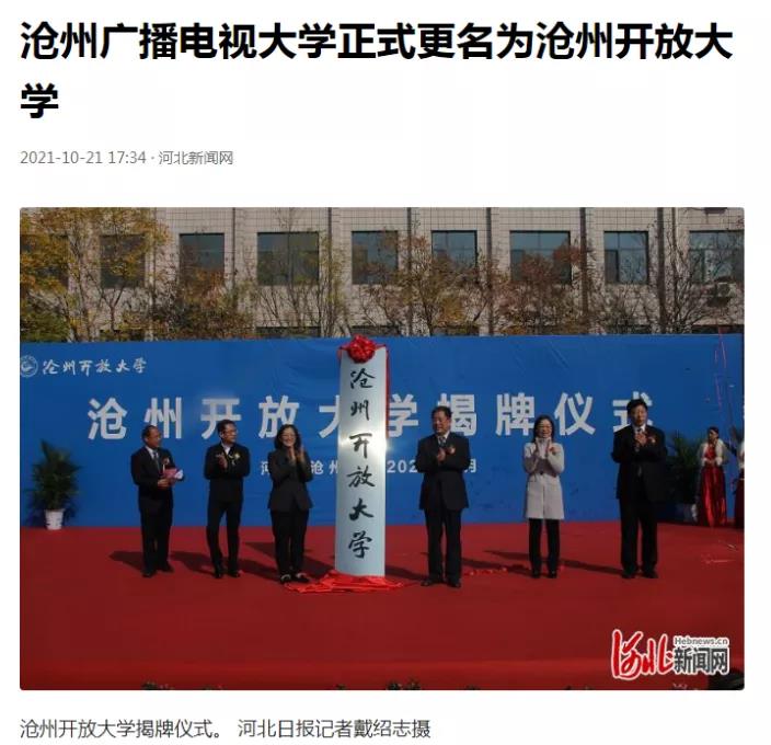 日前,滄州開放大學(xué)舉行揭牌儀式,網(wǎng)易新聞、河北新聞網(wǎng)、《燕趙都市報》新媒體、長城網(wǎng)、《滄州日報》、《滄州晚報》、滄州電視臺、滄州電臺等媒體對揭牌更名和滄州廣播電視大學(xué)所做的歷史貢獻(xiàn)給予了報道。此后,《人民日報》、《瀟湘晨報》等報刊新媒體和騰訊網(wǎng)、新浪網(wǎng)、今日頭條、一點(diǎn)資訊、新浪微博等十余家媒體平臺對報道進(jìn)行轉(zhuǎn)載,進(jìn)一步提升了滄州開放大學(xué)的知名度和美譽(yù)度。