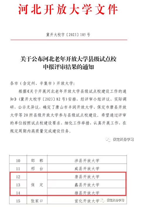 日前,河北老年開放大學(xué)縣級(jí)試點(diǎn)校申報(bào)評(píng)審結(jié)果出爐,保定唐縣、蠡縣及雄縣3所縣級(jí)開放大學(xué)入選”河北老年開放大學(xué)縣級(jí)試點(diǎn)?!保ㄈ」?0個(gè))。