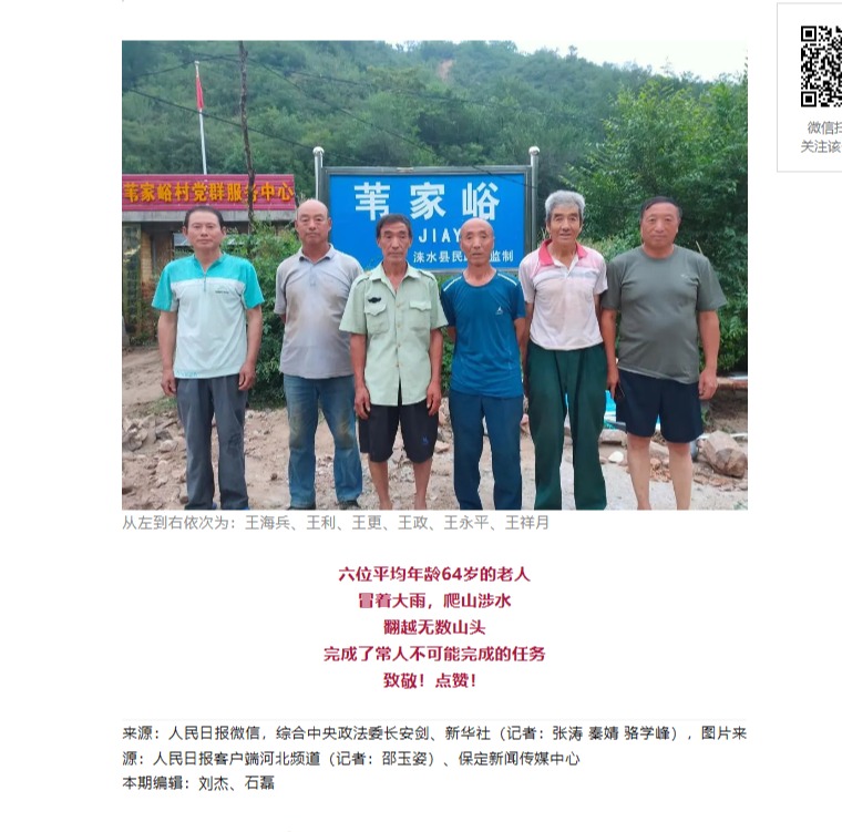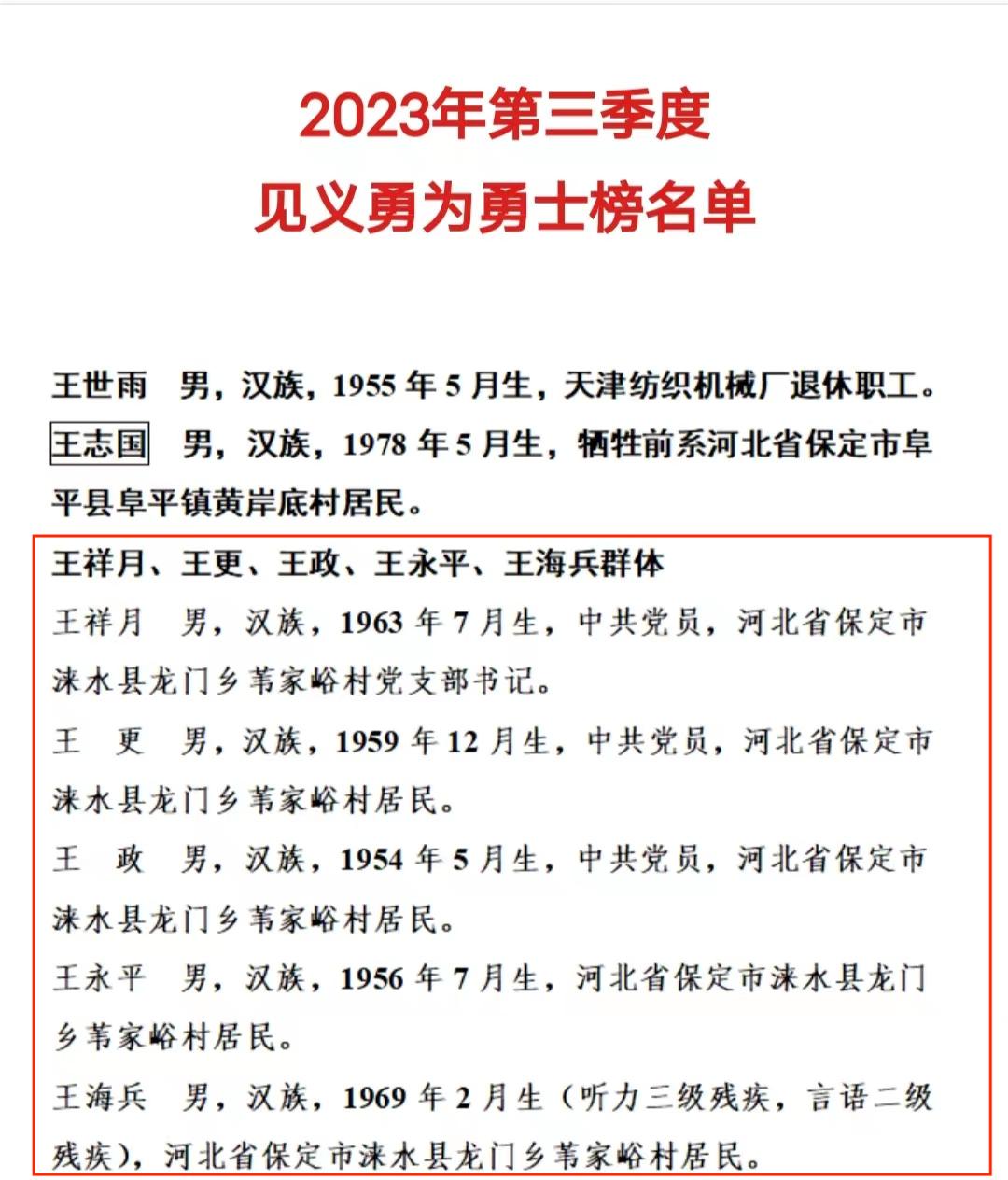 王祥月,中共黨員,葦家峪村黨支部書記,系淶水開放大學21春一村一行政管理(鄉村管理方向)學員。2023年7月31日,河北省淶水縣龍門鄉下著大暴雨,平均年齡64歲的王祥月等六位老人,用一副簡易擔架,抬著180斤重的受傷村民,跋山涉水,經歷兩天兩夜,成功把傷者送醫救治。2023年10月9日,中央政法委發布2023年第三季度見義勇為勇士榜,來自河北淶水的平均年齡六十多歲的王祥月等多位老人光榮上榜。(撰稿:黃秀青   校對:王巖   審核:趙甫安)