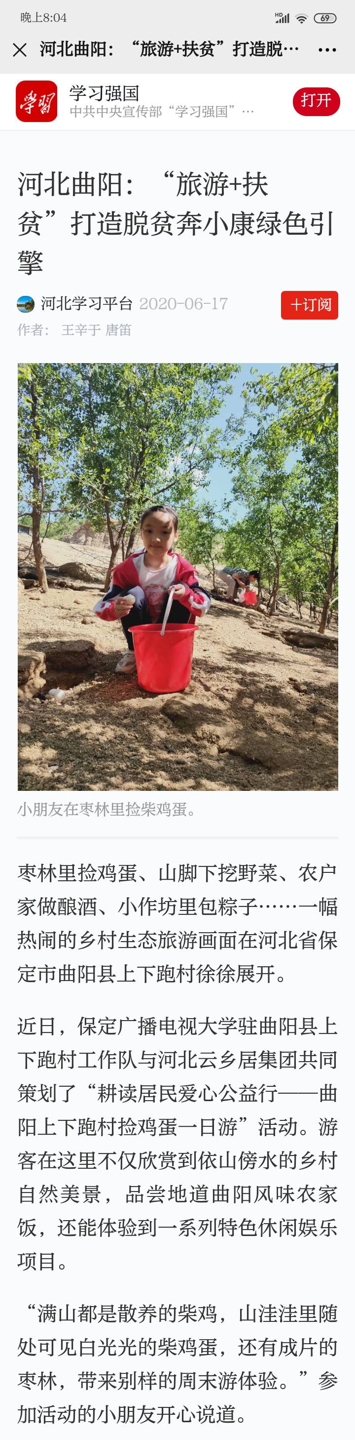 近日,“學習強國”報道保定電大駐村工作隊“旅游+扶貧”活動。保定電大駐曲陽縣上下跑村工作隊與河北云鄉居集團共同策劃了“耕讀居民愛心公益行——曲陽上下跑村撿雞蛋一日游”活動。游客在這里不僅欣賞到依山傍水的鄉村自然美景,品嘗地道曲陽風味農家飯,還能體驗到一系列特色休閑娛樂項目。