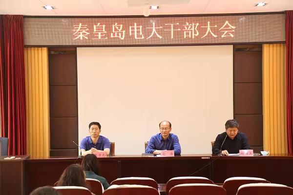 5月27日,秦皇島電大在一樓多功能廳召開干部大會。市委組織部副部長、三級調研員尚海出席會議。學校領導班子成員、各處室系負責人參加會議。市委教育工委書記、市教育局局長劉紅軍主持會議。