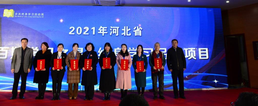 河北省教育廳二級巡視員、職成處(老年教育處)處長石建平宣讀了《河北省教育廳關(guān)于公布2021年河北省“百姓學(xué)習(xí)之星”和“終身學(xué)習(xí)品牌項目”的通知》,教育廳高教處處長彭繼東、省成協(xié)秘書長林志淼為獲獎代表頒獎。教育廳職成處(老年教育處)副處長邢文海宣讀《關(guān)于公布河北省社區(qū)教育老年教育系統(tǒng)慶祝建黨100周年主題活動評選結(jié)果的通知》,團省委丁玉立部長、省老齡辦張琳處長為獲獎?wù)叽眍C獎。